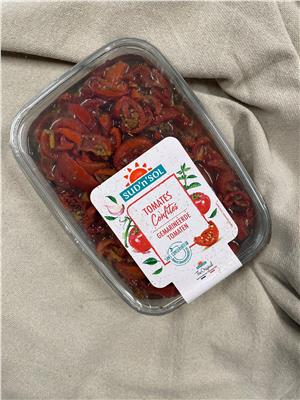 Sud'n'Sol gekonfijte tomaten zijn heerlijke kwartjes van halfgedroogde tomaten, gemarineerd met mediterrane smaken. Bereid van verse tomaten, in vieren gesneden, half gedroogd en vermengd met oliën en aromatische kruiden.